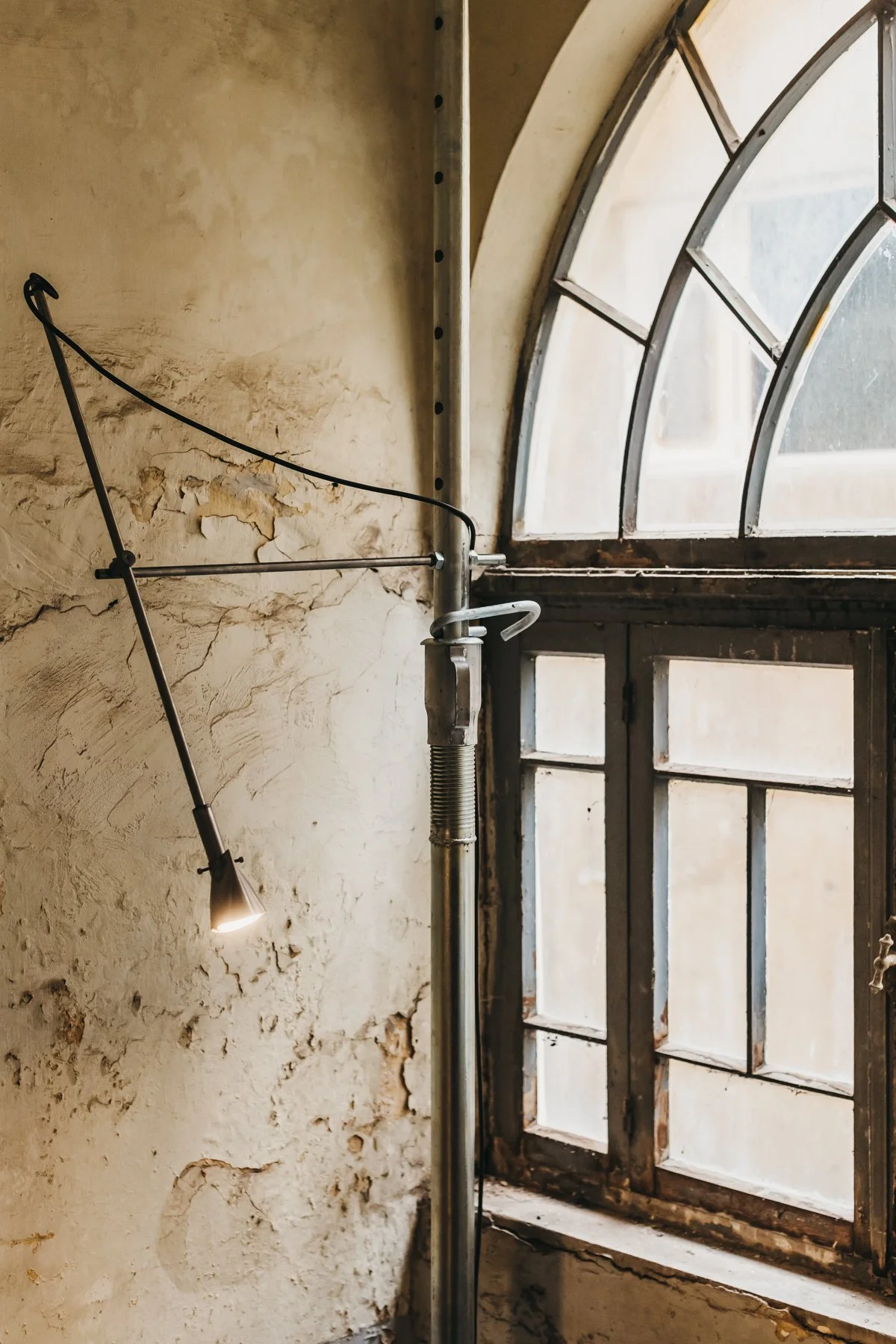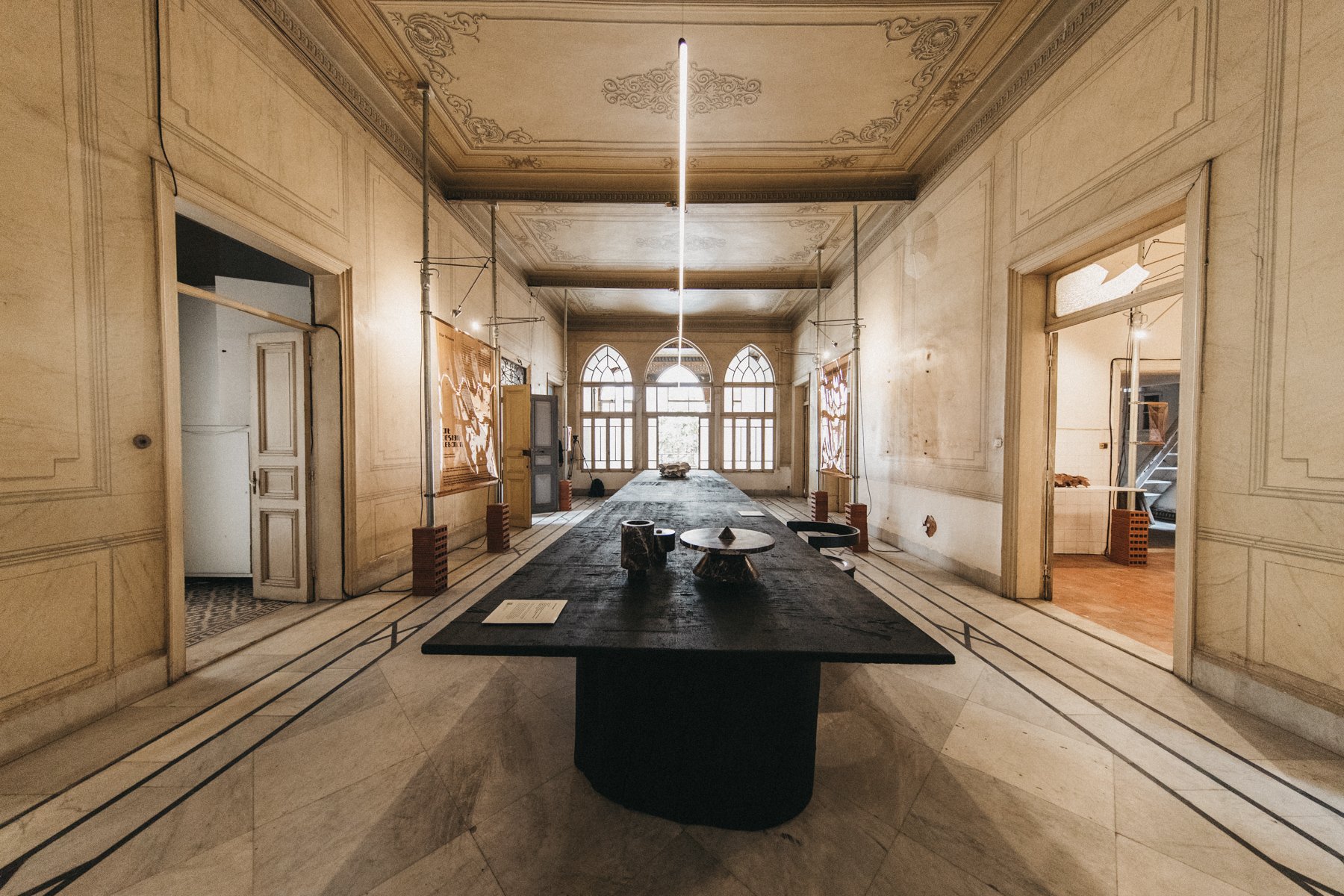 Understanding the unique architecture of the building to be as valuable as the objects on display, the exhibition design is minimalist in its approach, keeping the space as untouched as possible. The building has been cleared of debris – with fragments stored safely for future restoration – but its state of decay remains evident, the effects of history left visible in its fabric. The artworks and design objects from contemporary makers animate its various rooms and spaces, punctuating the building’s original ornamental features.
