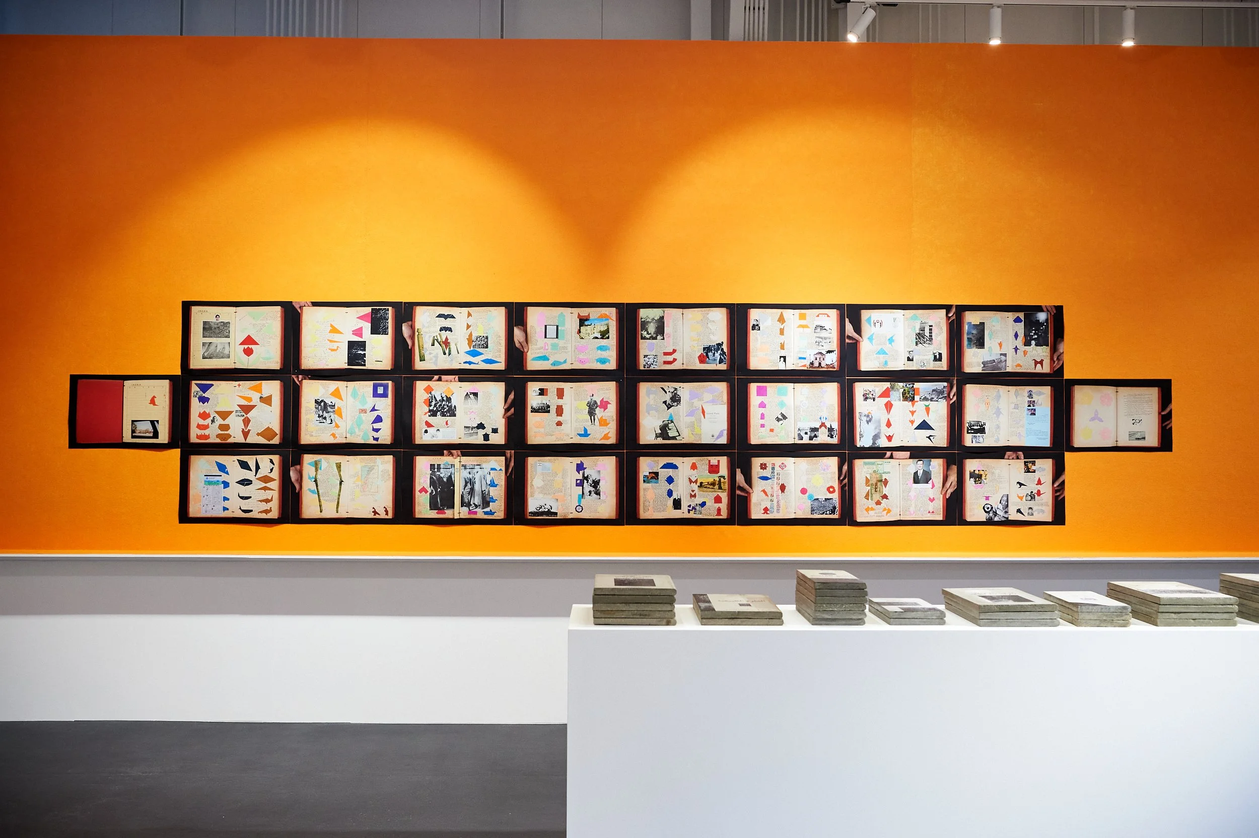 Given the transparency of Warehouse421 with its open galleries and courtyards, gave us the chance to create a wide platform that shifts from the existing architecture to link all the dispersed content within the space. With the neutrality of the colors and materials at the gallery, this platform pops up as a monochrome gesture that hosts all content – from books to screenings to displayed objects – and it creates space for bigger installations to cross the color limit and bleed into the negatives and courtyards. All together creating a holistic scene for the show, while maintaining flexibility of the content distribution and free ways of circulation depending on the curation.