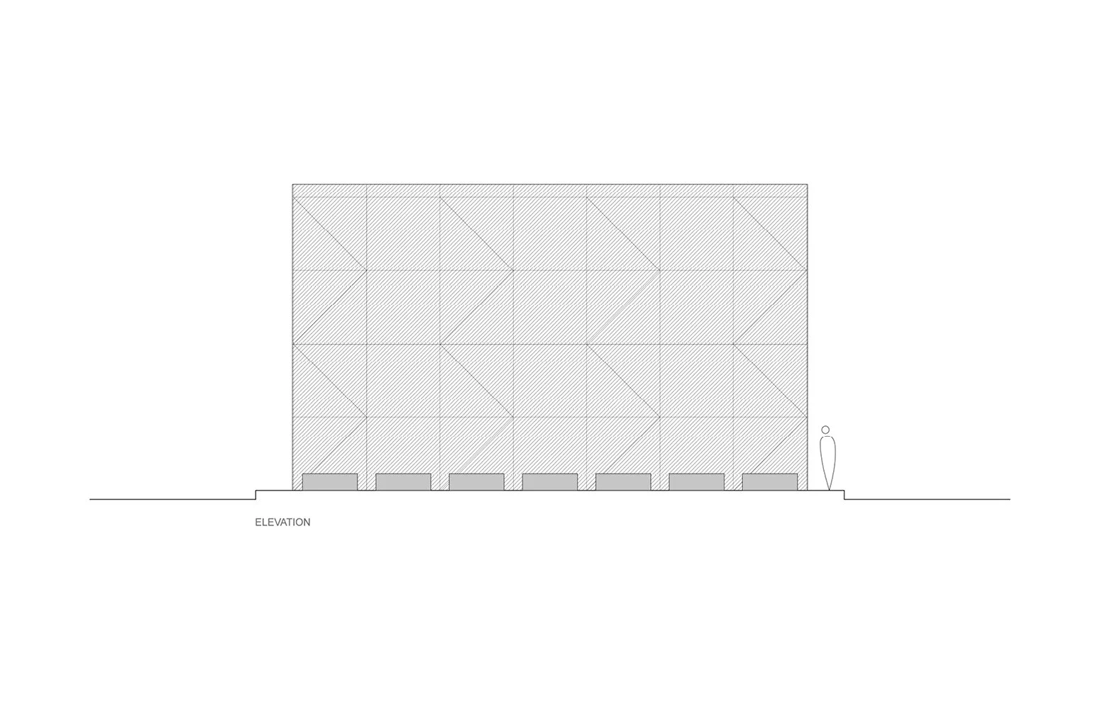 Designed with intrigue from inside and out, the installation stands as a mute element between the buildings of the newly designed district. With its exposed structure and its simple facades, the monument’s scale pushes the visitors to curiously discover what is inside its blind mass.